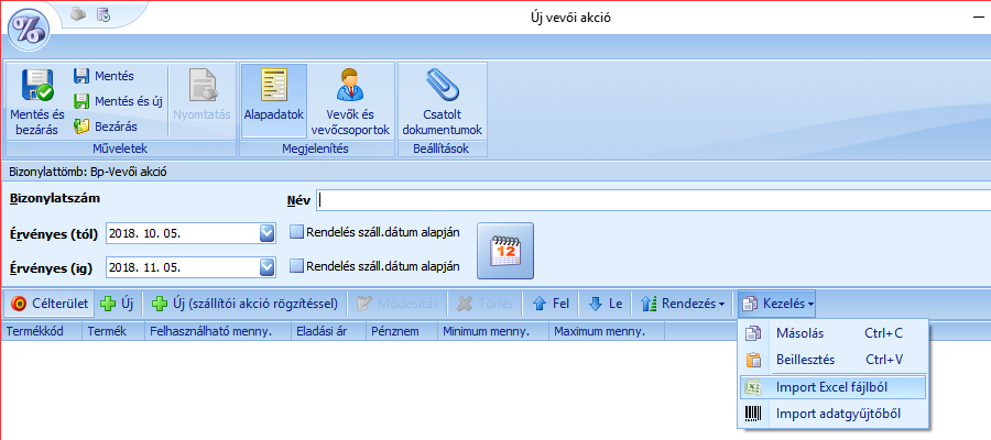 Az alapadatok között megadhatjuk az akció nevét és érvényességi idejét akár rendelések szállítási dátumához kötve. Ilyenkor a rendelés számlára történő átvételénél egyből az akciós ár kerül megjelenítésre és felhasználásra. Megadhatjuk az akcióban szereplő termékek listáját a táblázatunkkal, ha a Kezelésre, majd pedig az Import Excel fájlból menüpontra kattintunk. Amennyiben a táblázatunk fejléce megfelelő (Kód, Egységár), a program felismeri az oszlopokat, és csak az importálásra kell kattintanunk, majd pedig a pénznemet kell kiválasztatnunk, és megkezdődik a tételek feldolgozása.